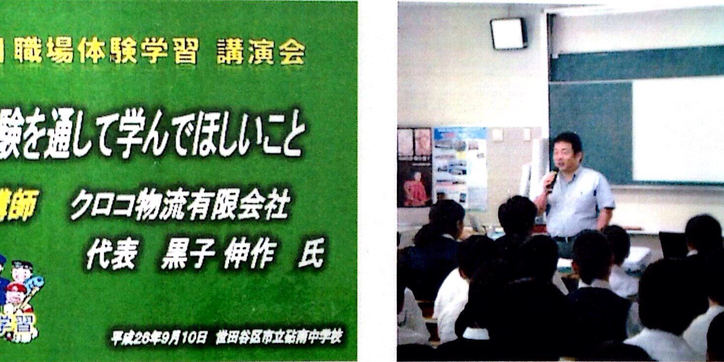 9月302014ブログ都内公立中学校2年生の皆様の第2回職業学習講演会にて代表黒子伸作が講演致しました。 生徒の皆様の今後のご活躍をお祈り致します。 Post navigationPreviousPrevious post:新人研修の様子NextNext post:テレビ朝日 モーニングバードに弊社配達の様子が放映されました