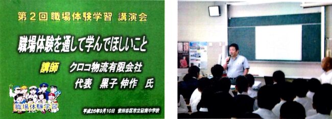 都内公立中学校2年生の皆様の第2回職業学習講演会にて代表黒子伸作が講演致しました。 生徒の皆様の今後のご活躍をお祈り致します。